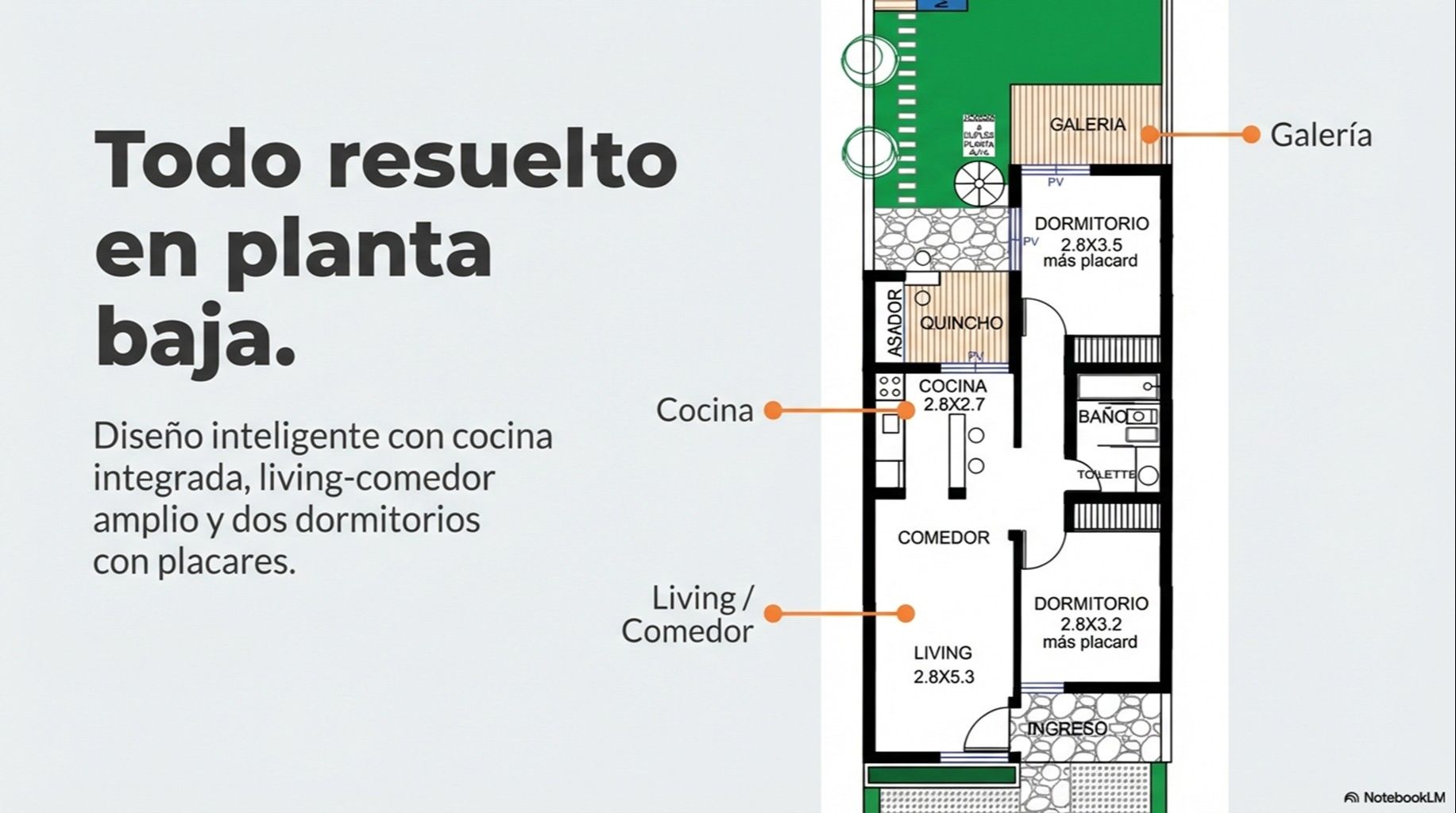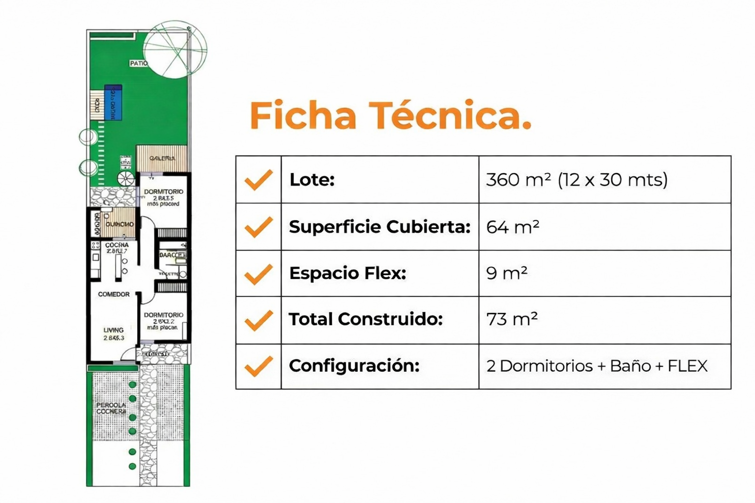 Las medidas y chiches del DUflex: 73 m2 de construcción + 180 m2 de lote.